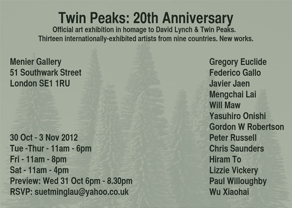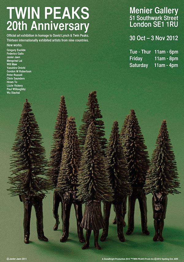 David Lynch’s Twin Peaks (1990-1991) remains one of the most important television series ever made. Its distinctive combination of humour, sadness and tension still reverberates throughout our culture, influencing fashion, music and photography, as well as film and television. Now, on the twentieth anniversary of the cinematic prequel Twin Peaks: Fire Walk With Me (1992), Europe’s first official exhibition of art inspired by Twin Peaks will take place in London. Thirteen internationally-exhibited artists from nine different countries will display new works at the Menier Gallery in London’s Menier Chocolate Factory.